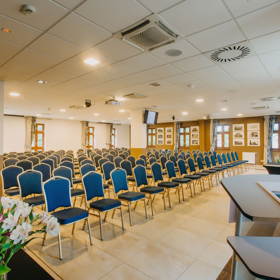 Sala Złota o powierzchni 156 metrów usytuowana jest na parterze centrum konferencyjnego i zapewnia stoły konferencyjne o wymiarach 140x90 cm oraz wygodne krzesła konferencyjne z możliwością montażu pulpitu. W układzie teatralnym mieści do 170 osób, w układzie szkolnym do 40 osób, w układzie „podkowa” do 65 osób. Zastosowanie systemu modułowego umożliwia sprawne podzielenie przestrzeni na dwie bardziej kameralne sale dostosowane do indywidualnych potrzeb naszych Gości. Każdy z modułów Sali w układzie teatralnym mieści do 49 osób, w układzie szkolnym do 20 osób, układ „podkowa” mieści do 45 osób, przy wspólnym stole zasiądzie do 30 osób.