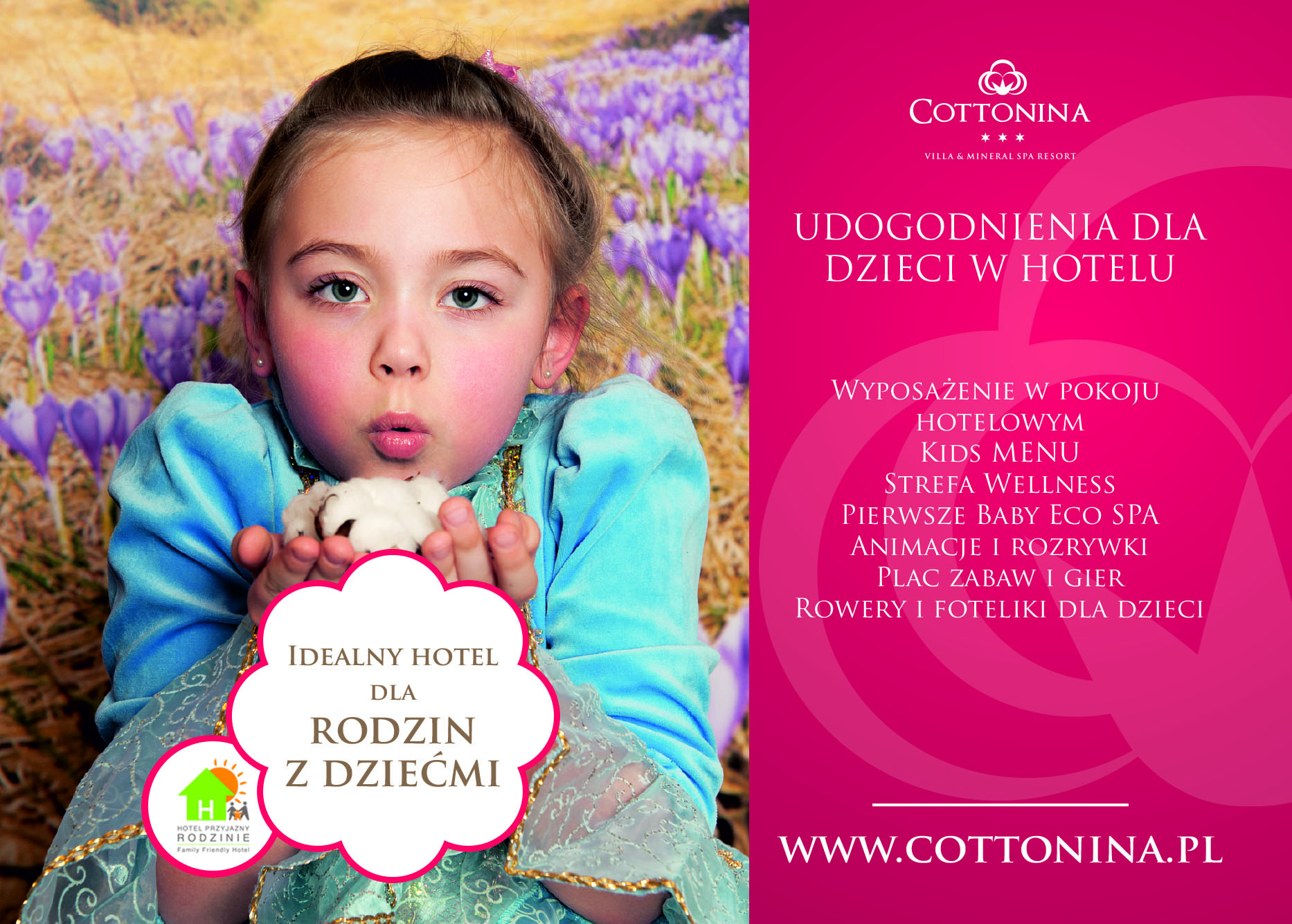 Mit Blick auf Kinder haben wir viele Annehmlichkeiten vorbereitet, die ihnen Komfort, Sicherheit, originelle Attraktionen und unbeschwerten Spaß bieten. Dazu gehören das originale Baby Eco SPA mit Behandlungen für die jüngsten, gut ausgestatteten Spielzimmer, Annehmlichkeiten in Zimmern, Toiletten, Restaurants und dem Schwimmbad, ein flaches Kinderbecken mit einem fröhlichen Brunnen, ein farbenfroher Außenspielplatz und Kinderfahrradsitze.