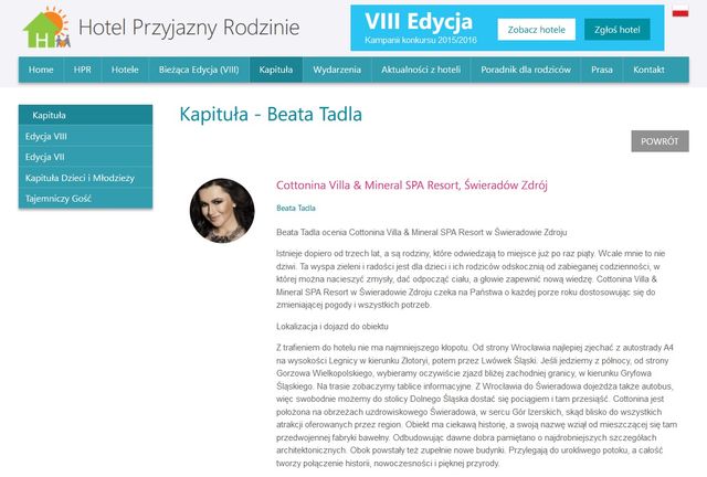 "Istnieje dopiero od trzech lat, a są rodziny, które odwiedzają to miejsce już po raz piąty. Wcale mnie to nie dziwi. Ta wyspa zieleni i radości jest dla dzieci i ich rodziców odskocznią od zabieganej codzienności, w której można nacieszyć zmysły, dać odpocząć ciału, a głowie zapewnić nową wiedzę. Cottonina Villa & Mineral SPA Resort w Świeradowie Zdroju czeka na Państwa o każdej porze roku dostosowując się do zmieniającej pogody i wszystkich potrzeb.