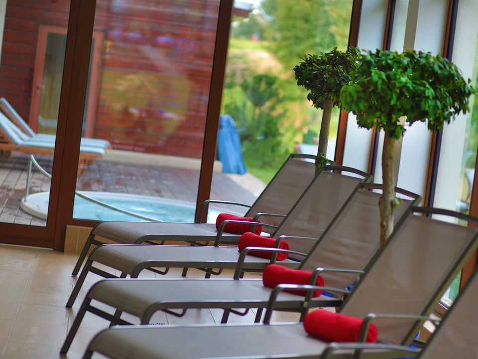 Przeszklone tepidarium z wygodnymi leżakami i pięknym widokiem na Czarny Potok pozwala na głębokie odprężenie i oderwanie od rzeczywistości.